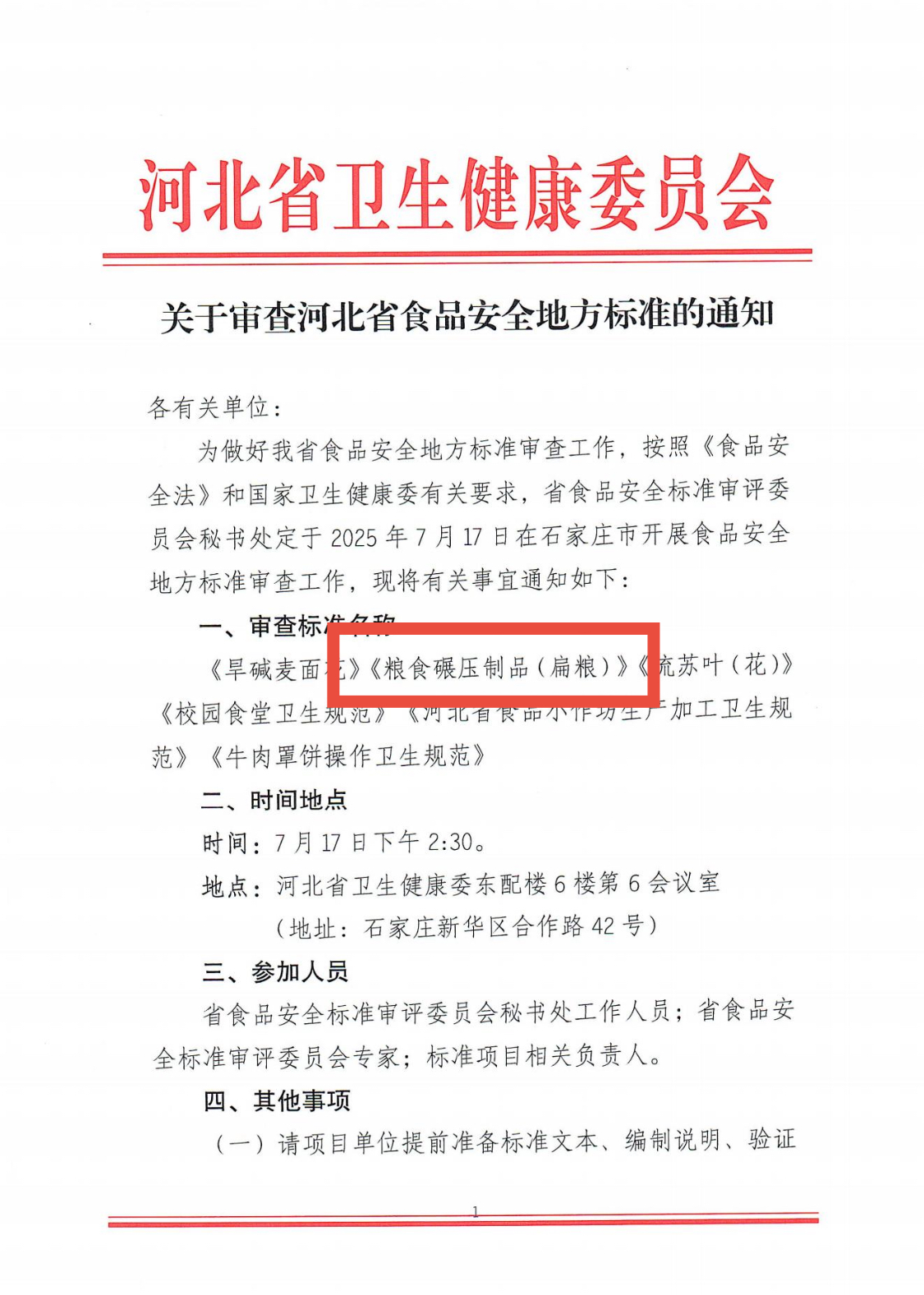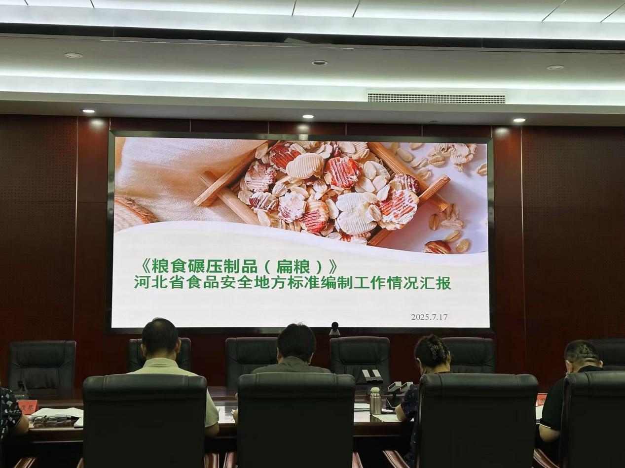 2025年7月17日下午,河北省食品安全地方标准审查会在石家庄召开,河北盘谷食品有限公司作为《粮食碾压制品(扁粮)》标准的牵头起草单位,赴省卫生健康委员会进行现场汇报。
